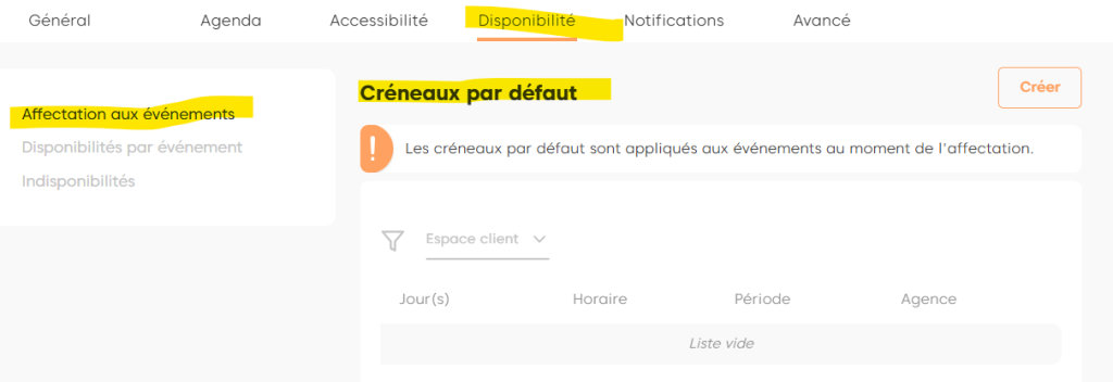 Ce nouveau fonctionnement introduit la notion de créneaux par défaut, permettant de définir en amont des plages de disponibilité qui seront automatiquement appliquées lors de l’affectation à un événement.