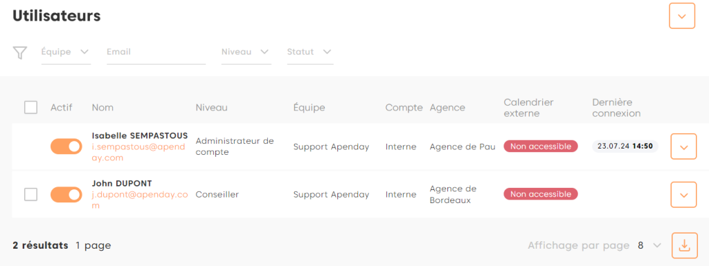 En tant qu’administrateur client et responsable d’équipe (selon vos attributions), vous accédez à la liste des utilisateurs.