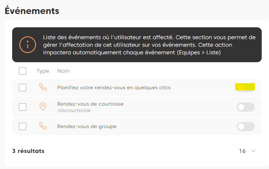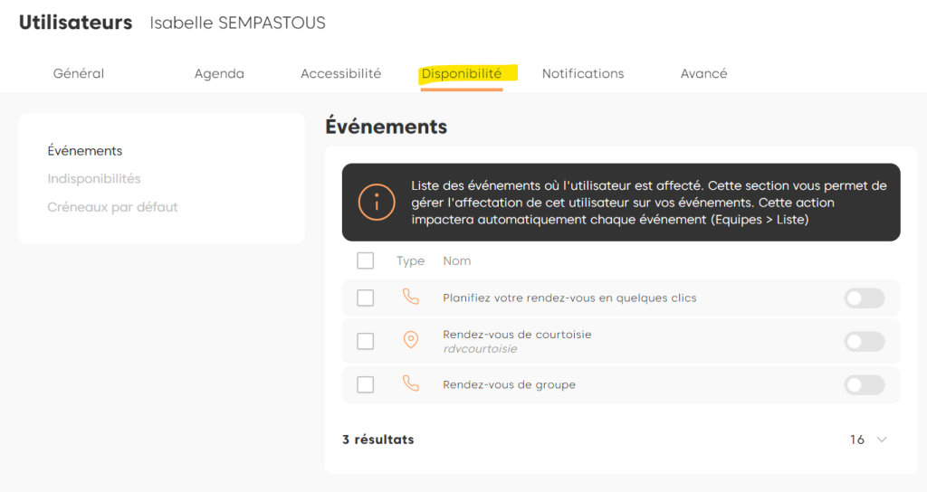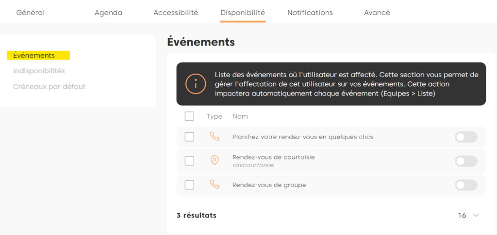 Accès : "Paramètres > Utilisateurs > Disponibilité > Evénements"