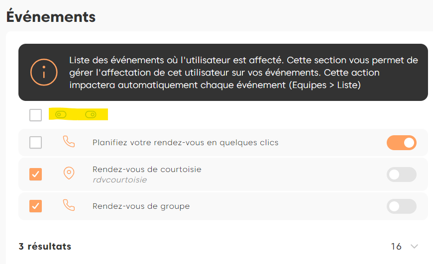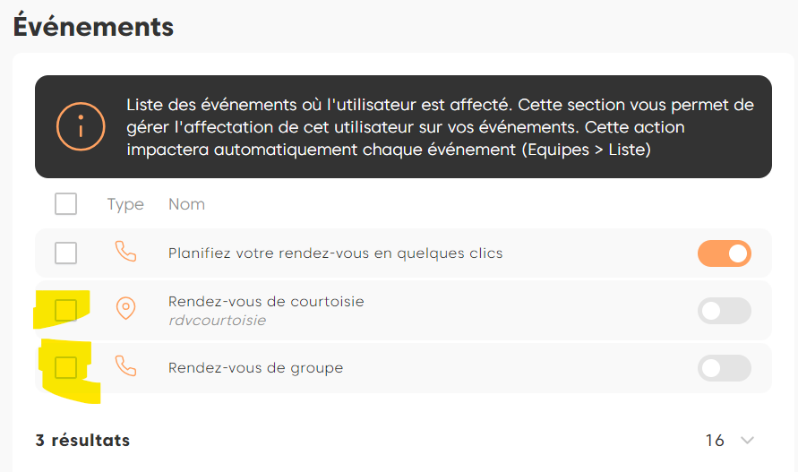 Si vous souhaitez ajouter l’utilisateur sur plusieurs événements, dans ce cas, vous allez sélectionner tous les événements concernés en cliquant sur la case affichée en début de ligne.