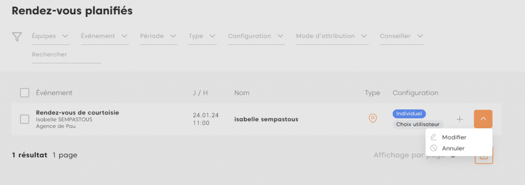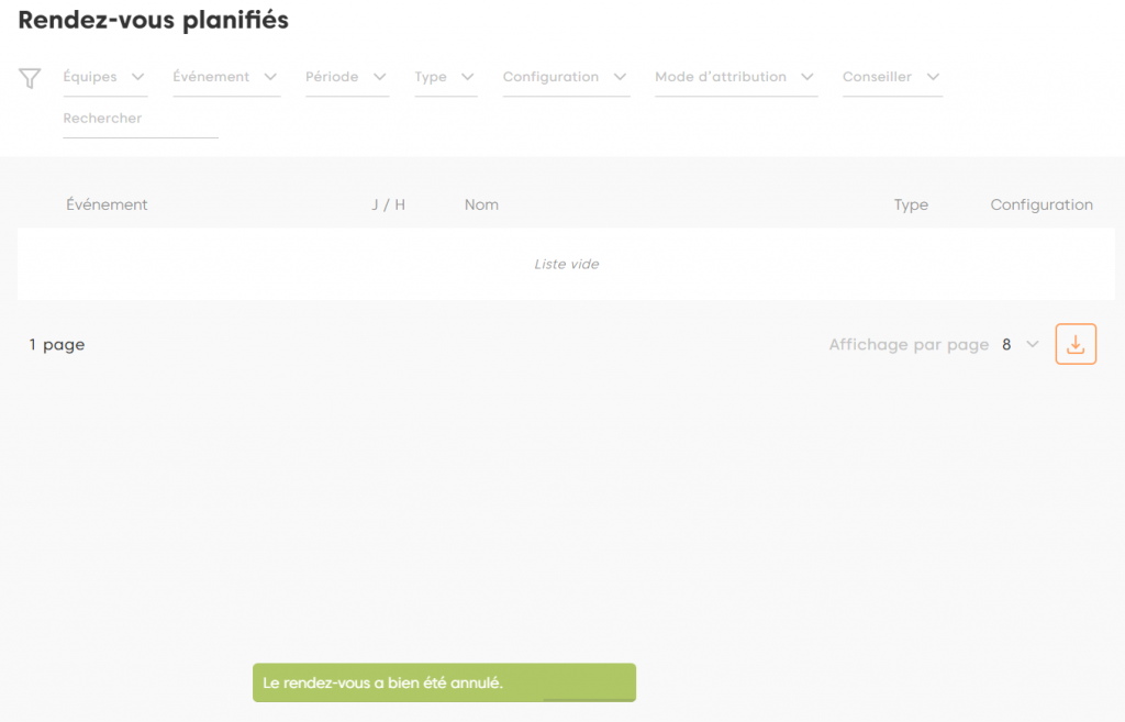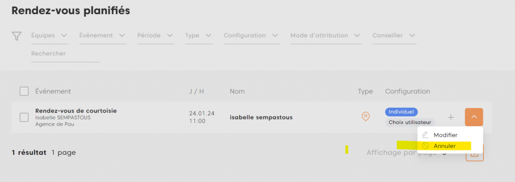 Dans ce cas, l’utilisateur devra repérer le rendez-vous à annuler sur la liste des rendez-vous planifiés.