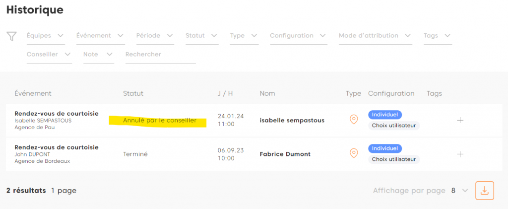 A présent, le rendez-vous est classé dans l’historique des rendez-vous.