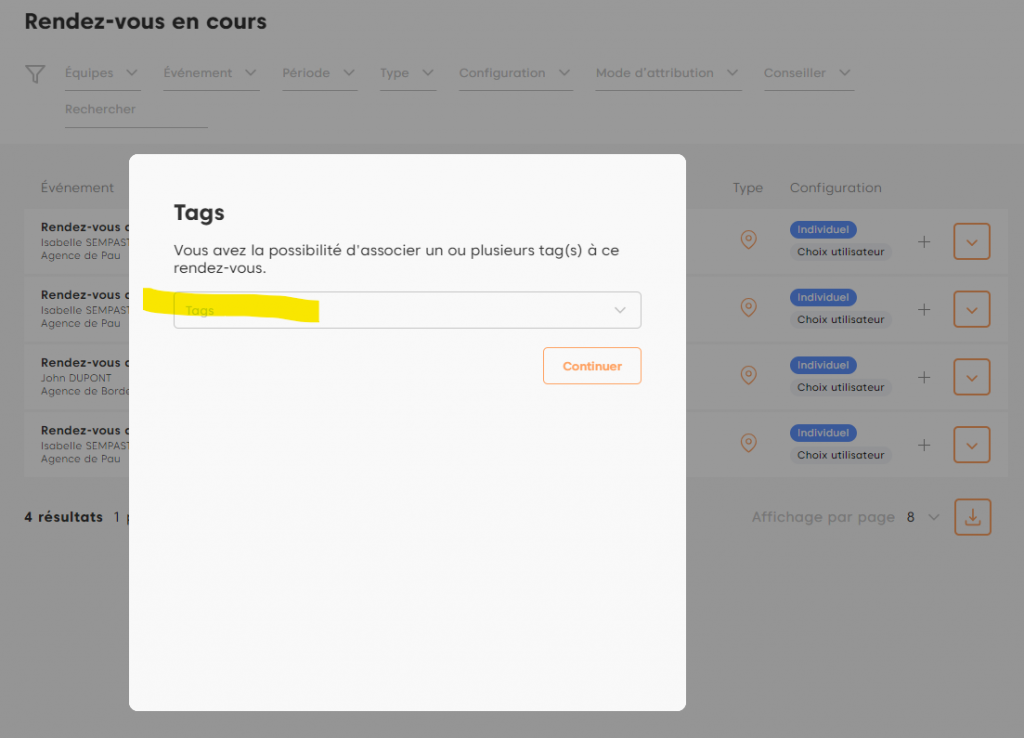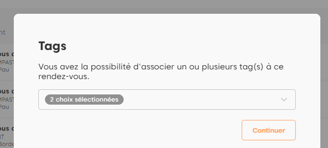 Lors de la déclaration d’un rendez-vous (Terminé ou Manqué), il vous est possible – si votre administrateur a activé la fonctionnalité – d’affecter 1 ou plusieurs tags à votre rendez-vous.