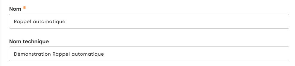 - Nom : nom fonctionnel visible dans l’interface (ex. Rappel automatique).