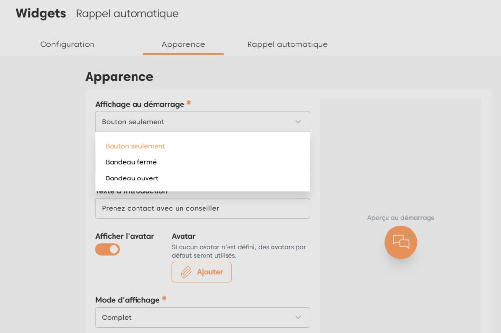 - Définissez si le widget s’ouvre automatiquement ou reste réduit.