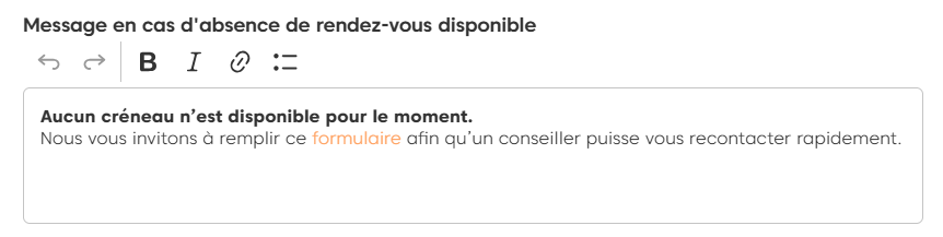 Durant cette configuration vous allez retrouver 2 types de « messages à afficher » qui correspondent à des indisponibilités : d’agence, s’il y en a ou de créneaux. La mise en page est personnalisable et vous pouvez également y intégrer des liens de redirection.