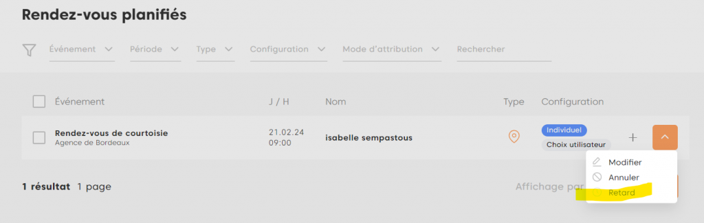 Une fois que vous avez identifié le rendez-vous, le bouton d’actions situé sur la droite vous présentera l’option Retard