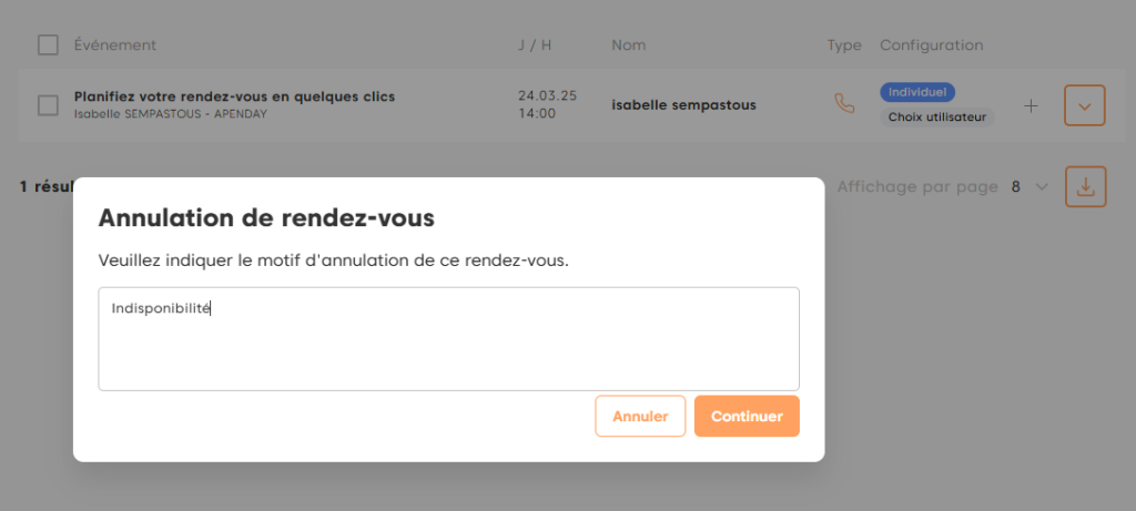 Apenday vous permet désormais d’imposer un motif d’annulation pour le client et de définir un motif d’annulation en tant que conseiller. Voici comment activer et utiliser cette fonctionnalité.