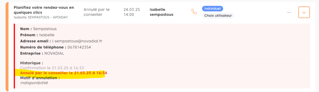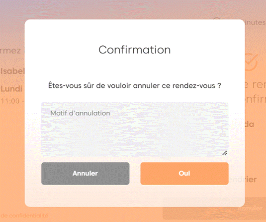 • Le conseiller peut également indiquer un motif lors de l’annulation d’un rendez-vous, mais cela reste facultatif.
