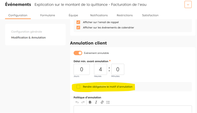 En tant qu’Administrateur ou Responsable d’équipe, il est possible d’imposer la saisie d’un motif lors de l’annulation par l’utilisateur, activez l’option correspondante dans la configuration de l’événement :