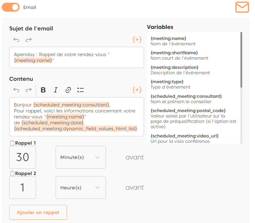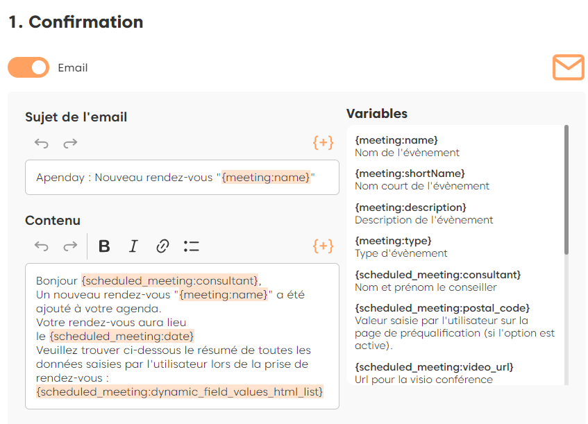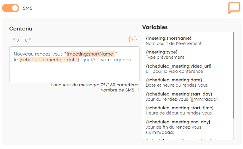 - Une liste de variables située sur la droite permet de personnaliser le message.