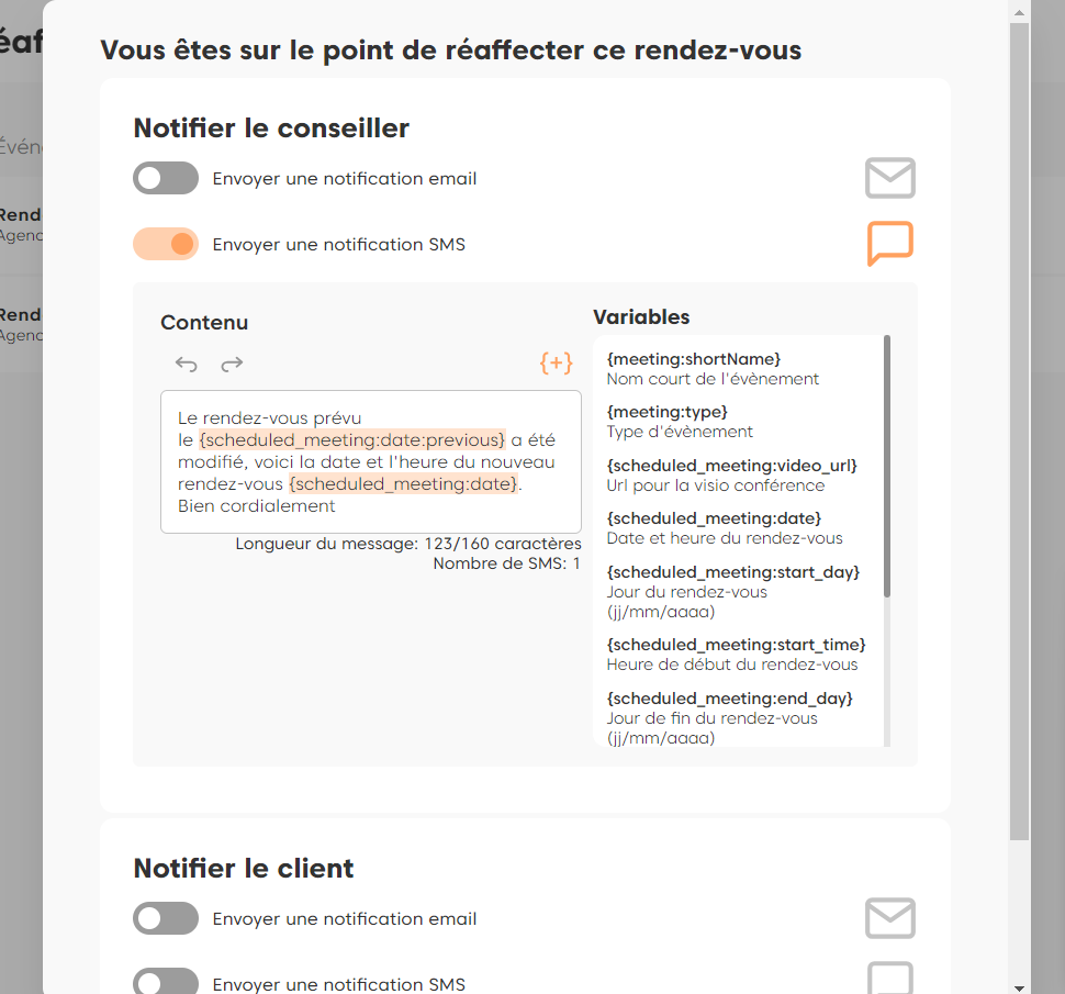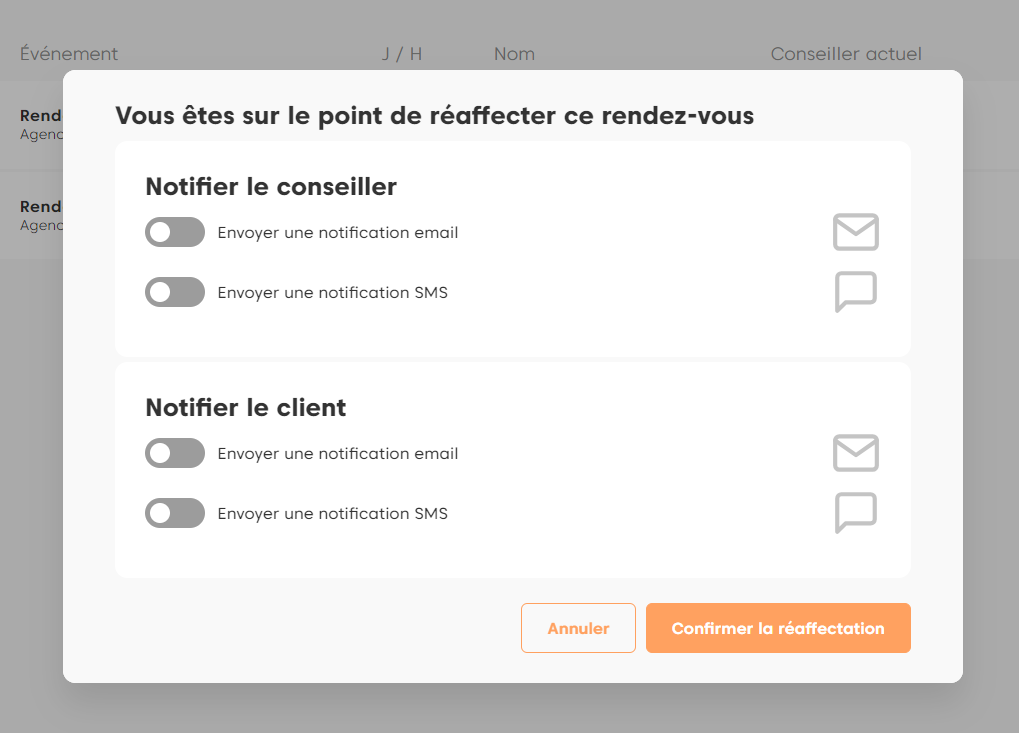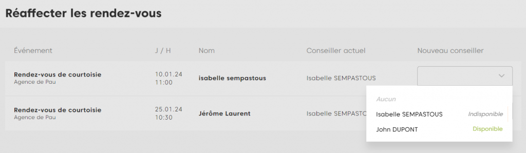 Au clic, une fenêtre intermédiaire apparaît et permet en quelques clics de réassigner les rendez-vous en ayant l’information sur la disponibilité :
