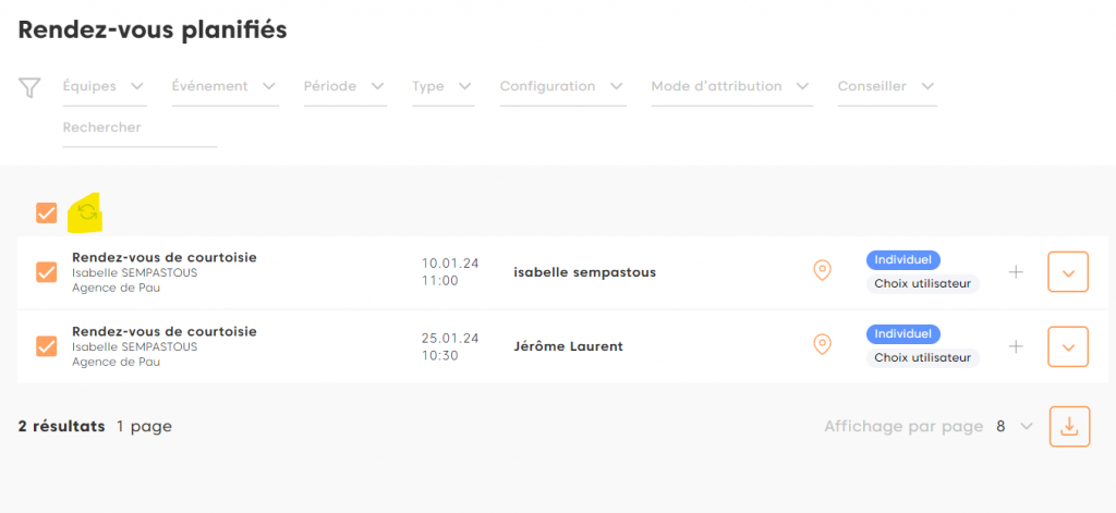 Un collaborateur a la possibilité, si ses droits lui permettent, de réassigner en masse les rendez-vous à venir.