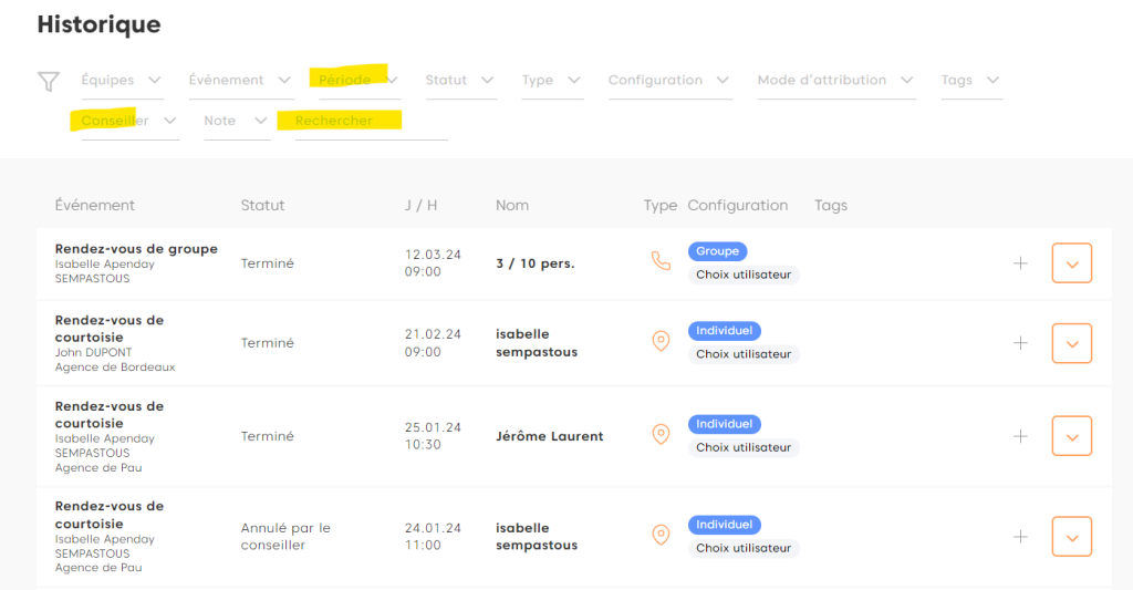 Ensuite, le système de recherche est similaire quelque soit le statut du rendez-vous. Des filtres sont à votre disposition en haut de chacune des listes.