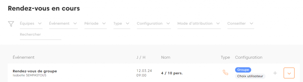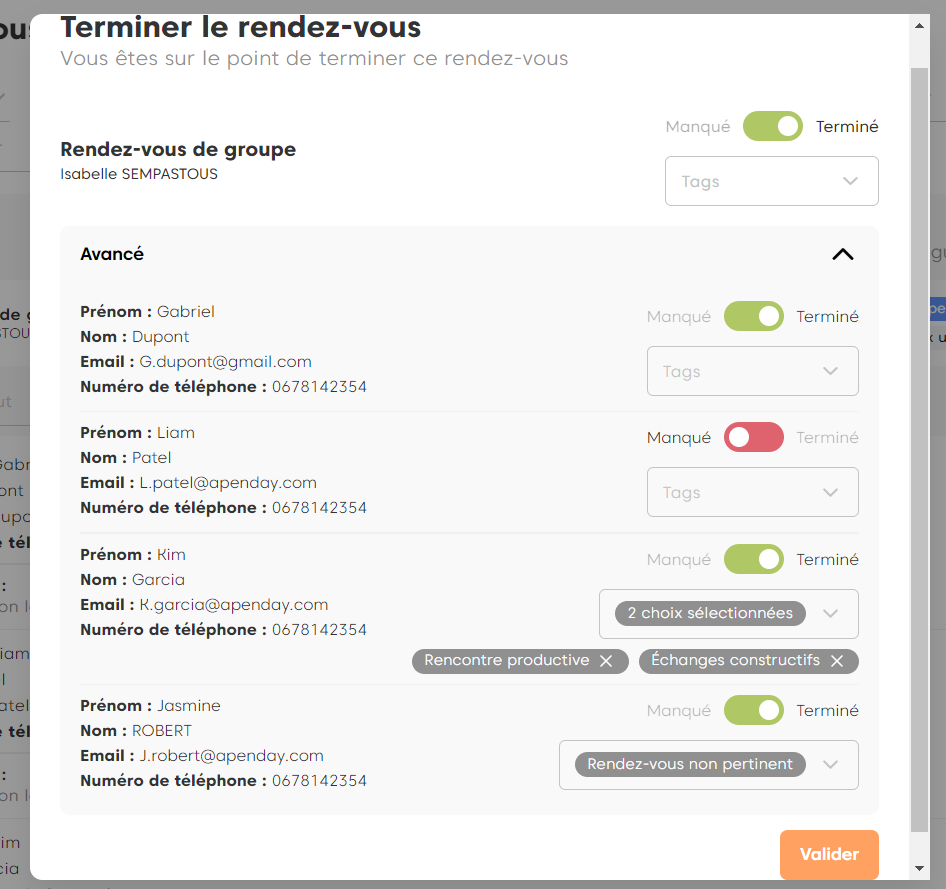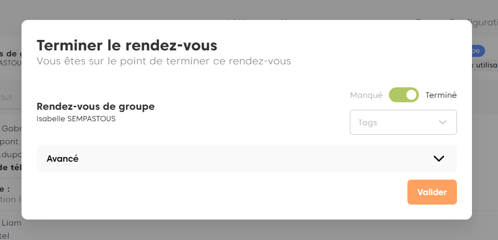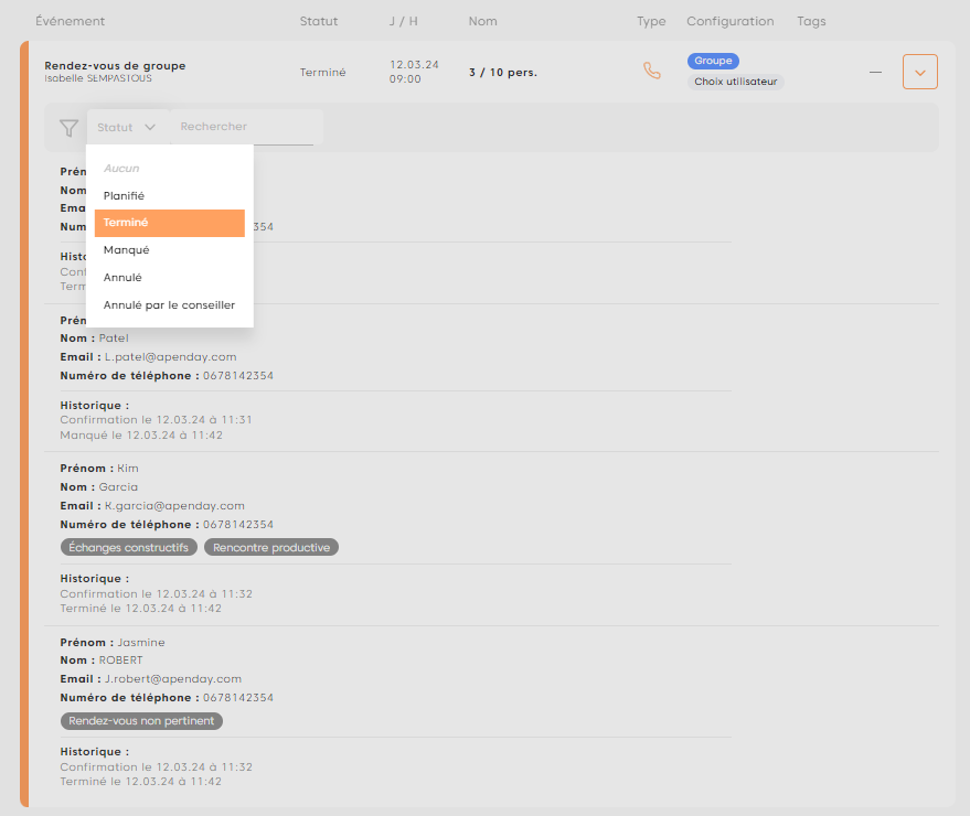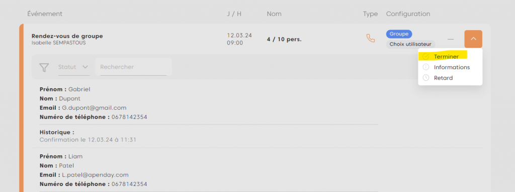 En tant que conseiller, vous avez la possibilité de Terminer un rendez-vous de groupe. Ainsi vous allez pouvoir déclarer Terminé ou Manqué chaque participation.