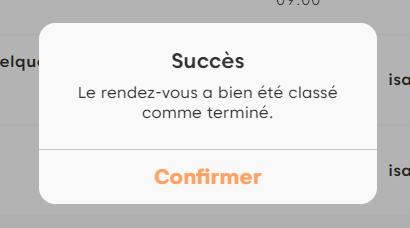 Au niveau de la liste des rendez-vous en cours, il vous faudra cliquer sur le bouton d’action situé à droite et sélectionner « Terminer« .