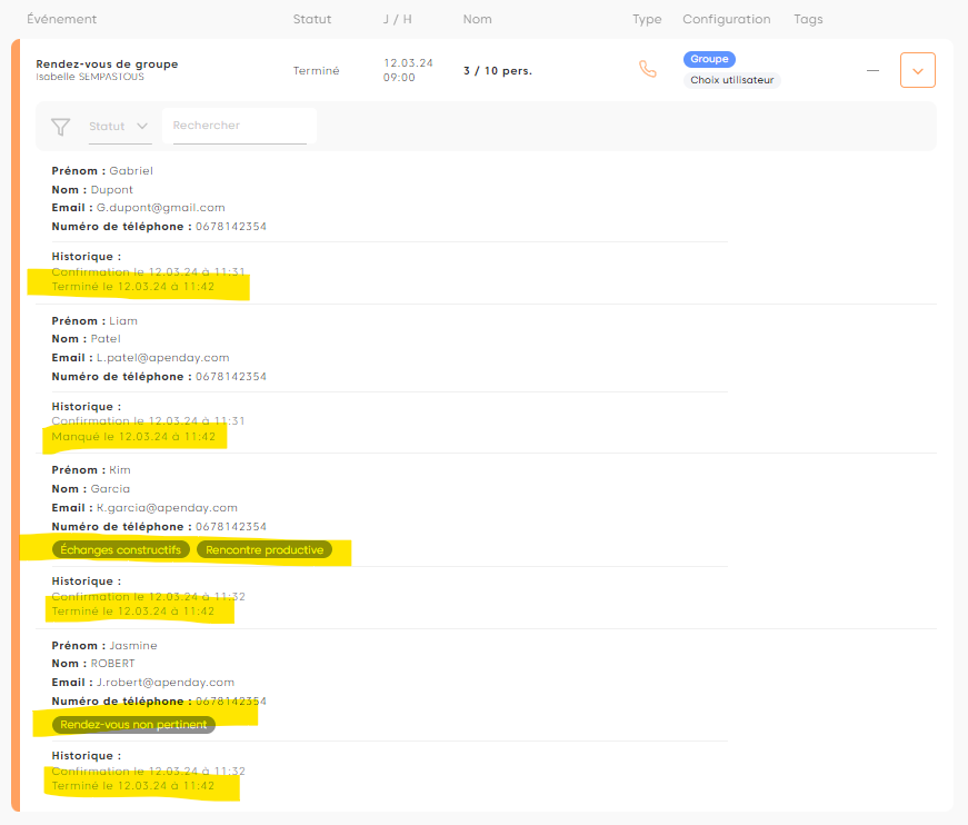 et vous retrouvez le détail de tous les rendez vous : Statut et Tags